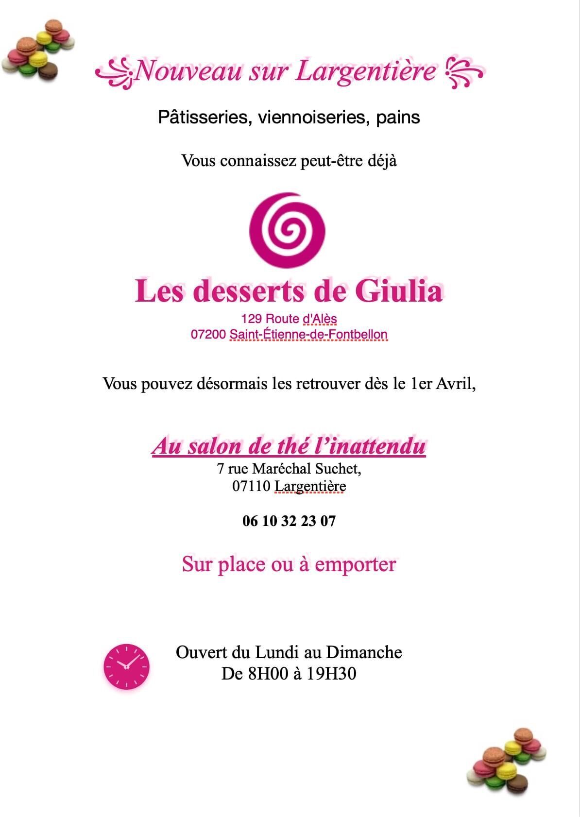 Laissez-vous convaincre le temps d’une pause gourmande par les pâtisseries fines des "Desserts de Giulia" au goût authentique accompagné d'un thé, d'une tisane bio, d'un café ou d'une boisson bien fraîche.